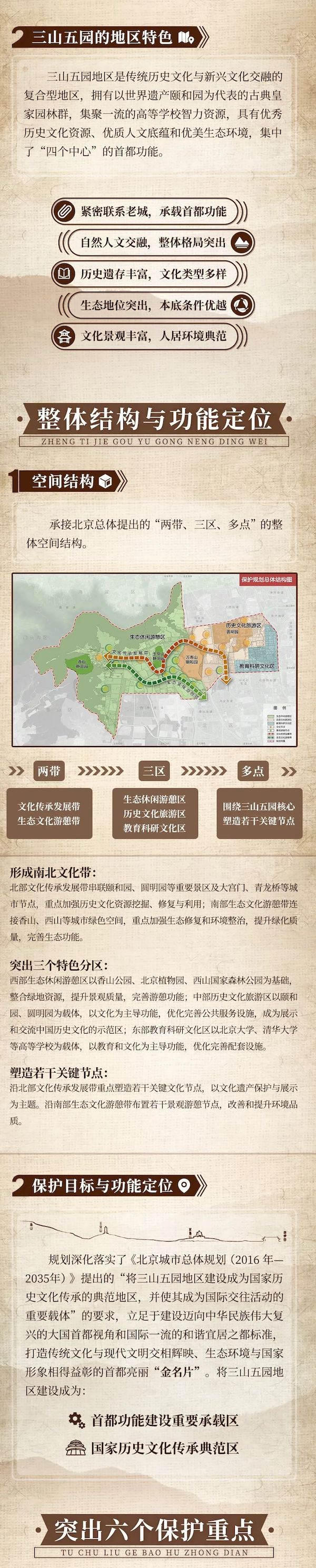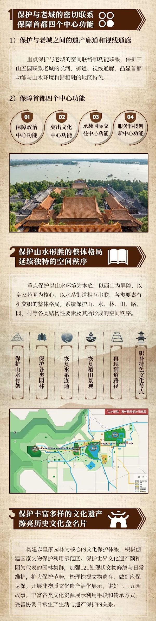 重点保护三山五园联系老城的长河、御道、视线通廊,凸显首都功能与山水环境和谐相融的地区特色;延续三山五园地区作为首都功能重要承载地的特点,完善配套设施,提升整体环境,保障政治中心功能,突出文化中心功能,承载国际交往中心功能,服务科技创新中心功能,充分保障首都功能的发展提升需求。
