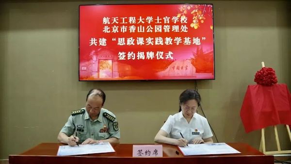 随后航天工程大学士官学校大校政治委员程忠与香山公园党委书记、园长孙齐炜共同签署合作协议,并为 “思政课教学实践基地”进行揭牌。