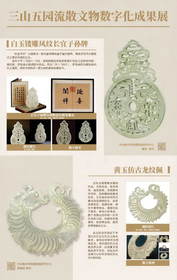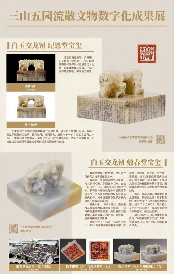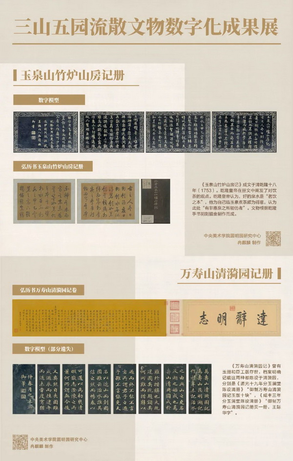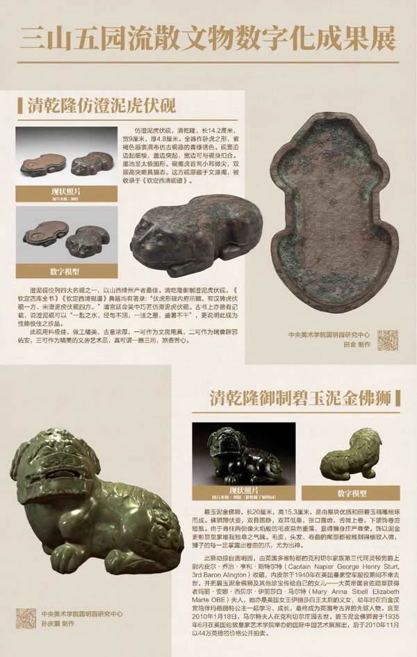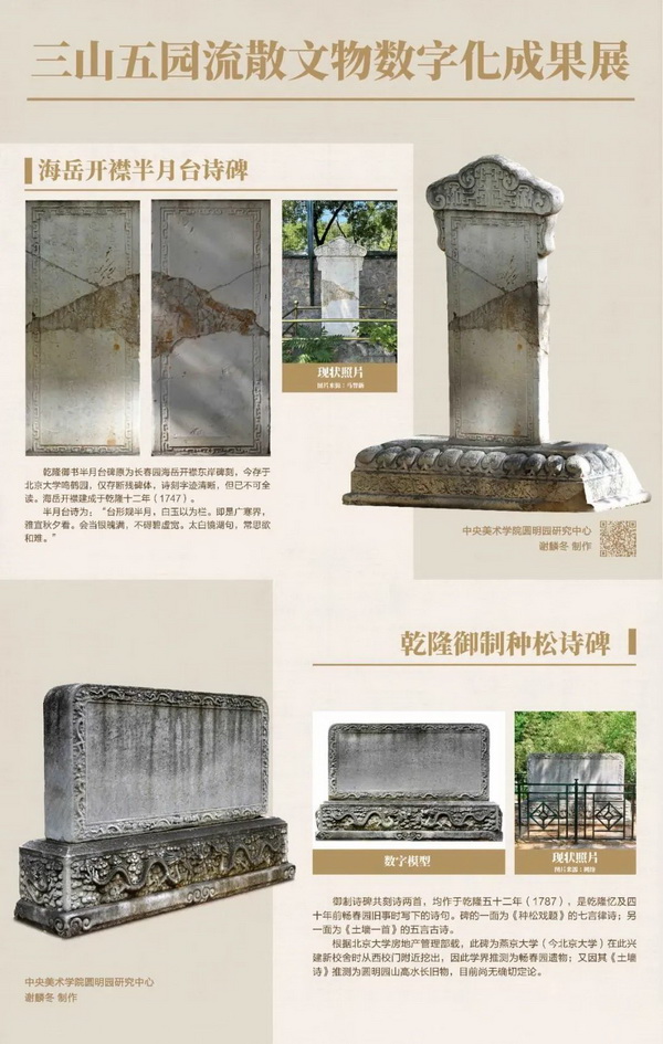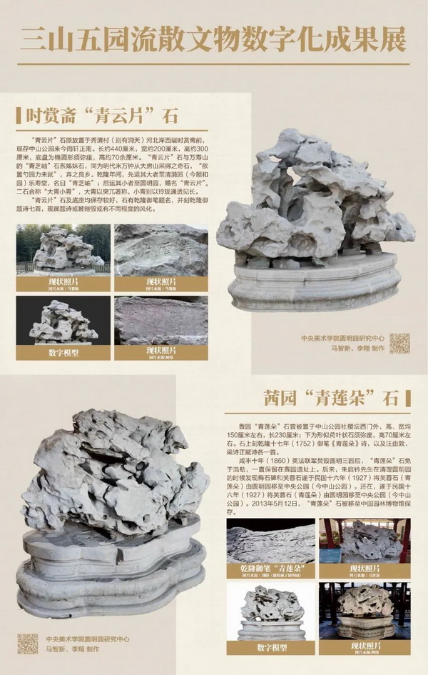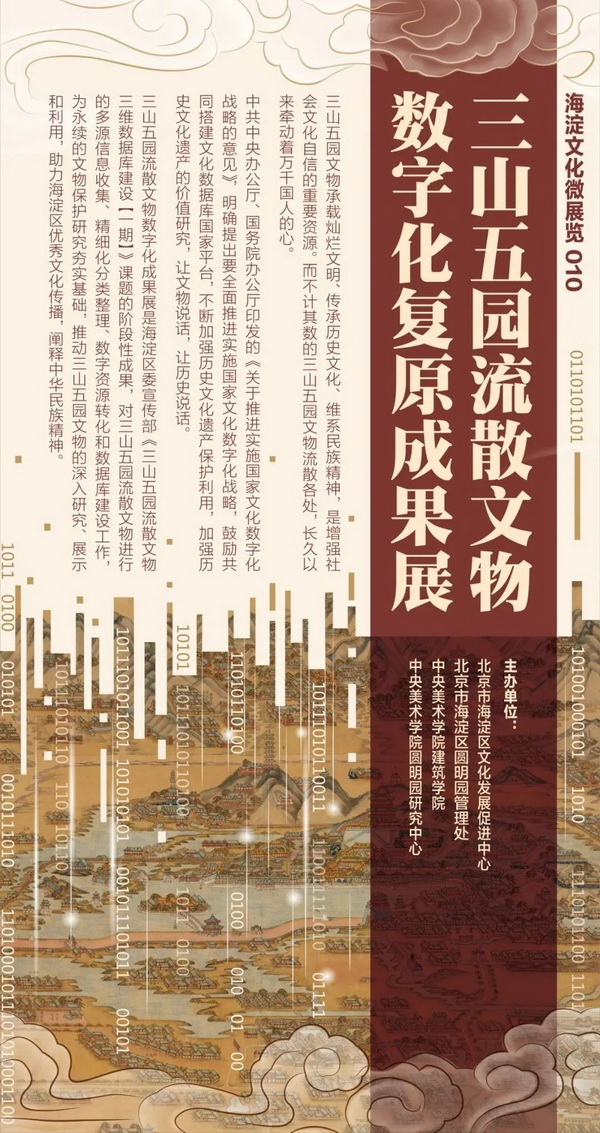 在海淀区文化发展促进中心与中央美术学院圆明园研究中心的共同努力下,“三山五园流散文物三维数据库建设(一期)”项目取得阶段性成果,日前,“海淀文化微展览·三山五园流散文物数字化复原成果展”在圆明园遗址公园春泽斋亮相。