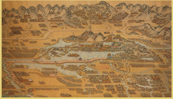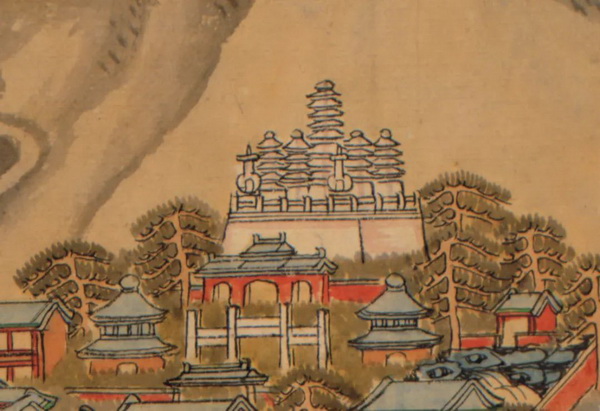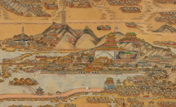 本图采用的就是第二种“山水画法”,全图形象逼真地绘制了京城西郊几乎所有的山峦、河流、园林、宫殿、庙宇、村落等,既秉承了传统“山水画”的意境,又最大限度地还原了当时“三山五园”的壮阔与绚丽。