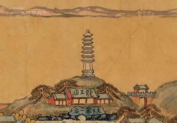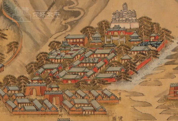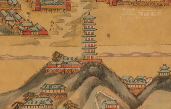 根据图中的景观朝向,我们可知画面方向:上为西,下为东,左为南,右为北。“真觉寺”即今天的“五塔寺”,“觉生寺”即今天的“大钟寺”。
