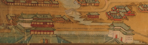 除了“空间面积”,某些“距离”也被作者进行了“压缩”处理,如此图左下角出现了几十里以外的“西直门”、以及“真觉寺(五塔寺)”和“觉生寺(大钟寺)”,它们的出现一方面是作为“三山五园”相对位置的参照,另一方面也确保了整条“长河”水系在图中有一个完整的呈现。